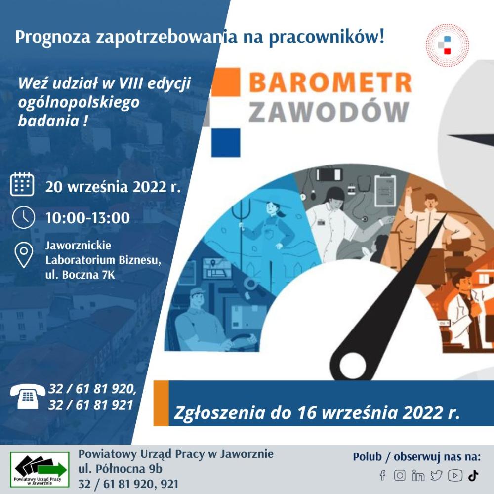 Kolejna edycja badania „Barometr Zawodów” ma na celu analizę sytuacji na rynku pracy, szczególnie pod kątem zawodów deficytowych, nadwyżkowych i zrównoważonych. Debata ekspercka zaplanowana jest na 20 września 2022 roku w Jaworznickim Laboratorium Biznesu, a zgłoszenia do udziału w badaniu przyjmowane są do 16 września 2022 roku. Uczestnicy panelu, w tym przedstawiciele firm oraz instytucji, będą mieli wpływ na interpretację wyników badania.